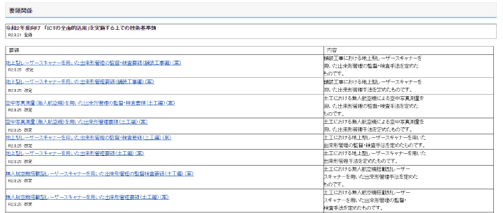 例えば、無人航空機(ドローン)や地上レーザースキャナー、無人航空機搭載型レーザースキャナーなど、国土交通省から発表されている最新の技術基準類の中から、何を使って出来形管理を行うのかを想定します。