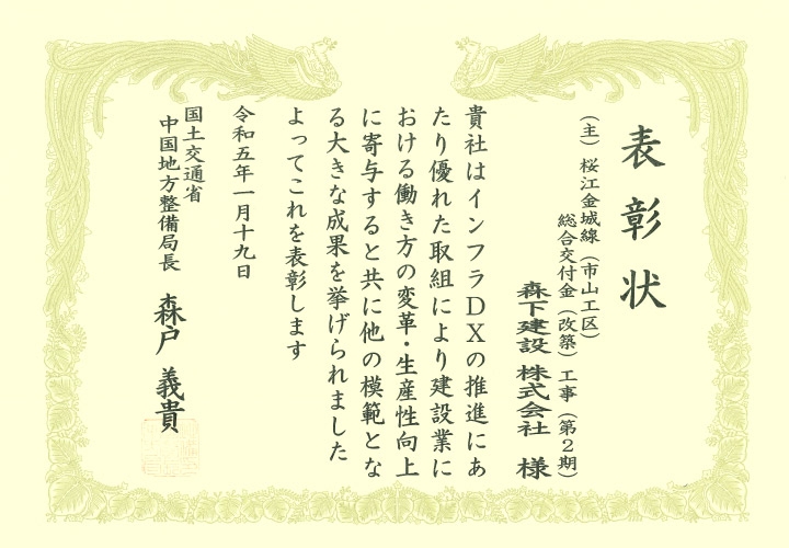島根県発注工事として初の「ICT法面工」で受賞