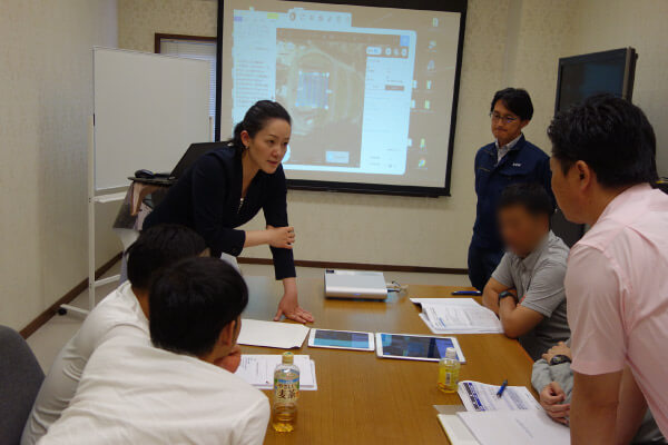 ICT活用工事を実現していくにあたり、受講者が教材データを使って社内や社外関係者に説明、教育ができるようになることを目的にした研修