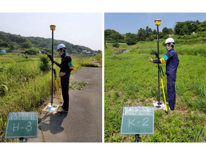 UAV(ドローン)を用いた三次元測量を実施。上空が開けている現場だったため、標定点・検証点の測定にはGNSS測量器を活用。
