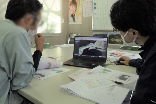 発注者へ提出するための「3次元設計データチェックシート」などの運用方法と、実際のデータをもとにした照査作業時の留意点をお伝えしました。また現場監督が作図中で出てきた技術的な疑問・質問に回答しました。ICT建機による施工の準備のための工程別作業内容を解説しながら対応判断の助言を行いました。 打合せの主な内容 ・3次元設計データ照査のポイント共有 ・現場データをもとに3次元照査作業を実施 ・3次元数量算出方法の共有 ・3次元ソフトウェア操作に関する技術的指導 ・伐採状況をふまえた測位システム運用の判断基準 ・RTK-GNSS基地局段取りのポイント共有 など