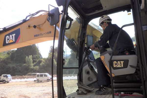 ICTバックホウに施工用3次元データを設定しました。本現場はICT掘削の数量自体は少量ですが、擁壁パネルを設置するために複雑な形状の床掘作業が必要です。現場監督としてはICT建機の活用により、現場の丁張レスによる生産性向上・安全性向上の効果を期待されています。