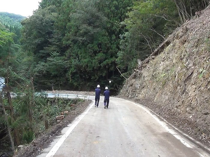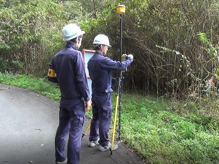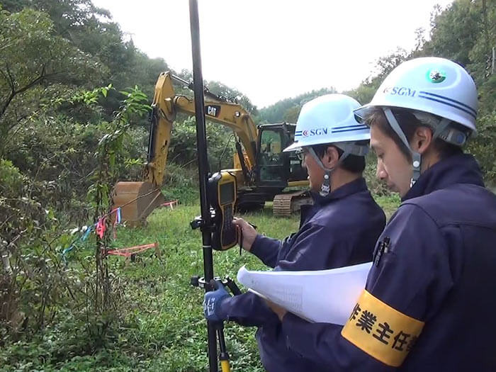 山間地域のため、GNSS電波の受信状況が良いとは言えない条件下において、ICT施工を実現できるように段取り。