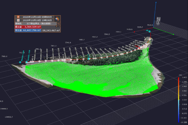 今年7月に発生した河川災害により、当初の設計よりも大きく現地盤が変わっている状況でした。3次元測量により把握できた正確な現況地盤と、3次元設計データ作成により算出した正確な数量データが、受発注者間の協議で有効活用されました。