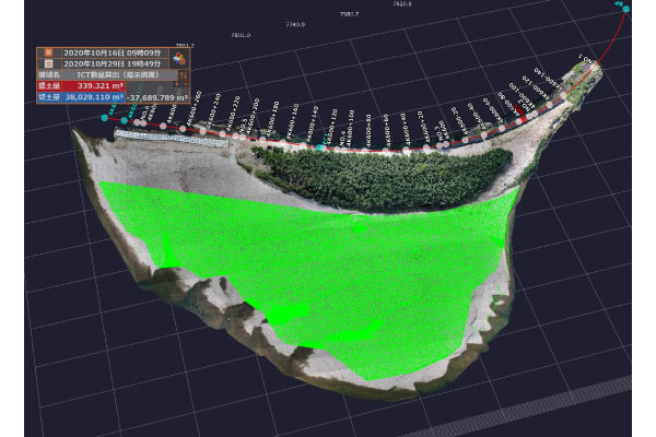 災害による現況地形の大きな変化がありましたが、3次元化することで受発注者間の協議が円滑に進み、正確な数量を算出することができました。変更後の指示図面をもとに3次元設計データを改めて作成しました。