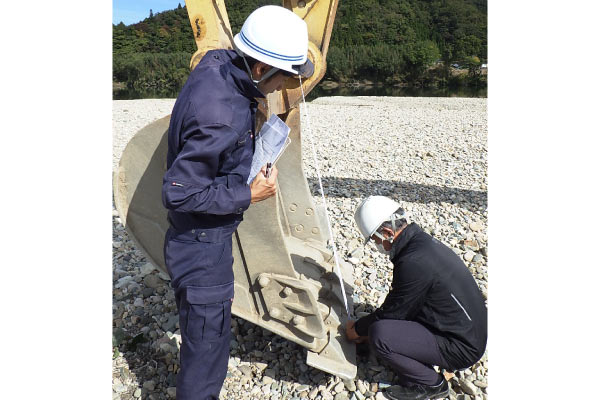 河川掘削工で使用するICT建機(バックホウ)の精度確認試験とバケットキャリブレーションを実施