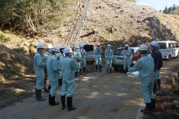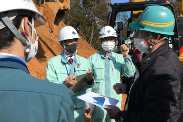 自治体職員の方々からのご要望で現在稼働中の現場でICT見学会が開催されました。元請会社ご担当の解説のもと、ICTバックホウのマシンガイダンス機能のデモンストレーションが行われました。若手職員の皆さんからの質問に答える質疑応答の時間も設けられ、現場目線の有意義なICT見学会でした。