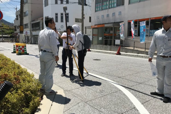 主要駅前開発に伴う路面工事による現況変更のため、2度目のUAVによる空中写真測量を行いました。今回は該当エリアのみを飛行させ、3次元ソフトウェア上で1回目の成果とデータを結合させました。飛行ルートが国道、県道、市道にまたがることから、飛行時間を早朝にするなど安全運航体制を強化し、昨年同様に松江工業高等専門学校の先生方のご協力のもと、対空標識のGNSS計測を行い、限られた時間内で作業を終えることができました。