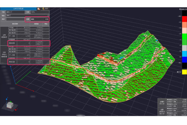 軟岩Ⅰの掘削範囲を反映したICT出来形判定データを作成。すべてのICT対象範囲で高い施工精度を確認。