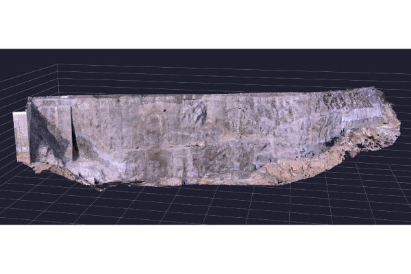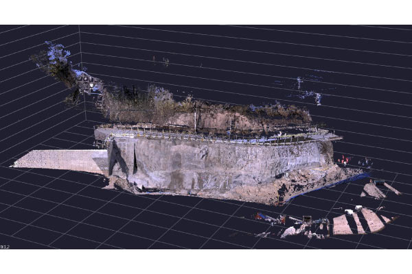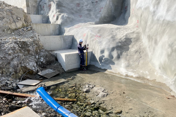 現場ではモルタル吹付の片付けと次工程のアンカー工に向けた施工段取りが進行していました。現場の作業が滞りなく進行できるよう、現場監督や下請施工業者と連携しながら、タイミングを見計らい地上型レーザースキャナー測量を実施しました。また、点群を取得できなかった箇所はTSで補測を行いました。