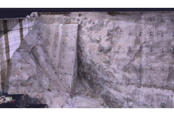 ICT法面工のモルタル吹付後に、「アンカー工でもICT管理できないか」という現場監督のご要望で、アンカー工の出来形管理もICTで実施することになりました。 今回の現場はクレーンでアンカー打ち込みを行ったため、足場が無い状態でしたが、地上レーザースキャナーによる計測を行い、318本のアンカー位置を点群データ上で確認することで、従来の出来形管理よりも作業効率と安全性を高めることができています。
