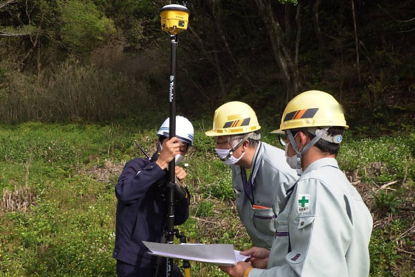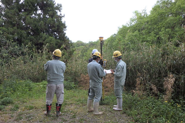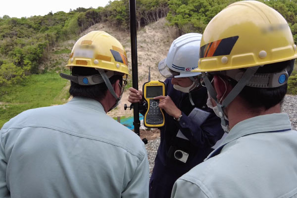 ICT施工計画立案のための現地調査を実施。現場代理人を始めとする元請会社の関係者と共に、調査時の確認点を現場で共有。この調査報告書をもとに、最適なICT施工計画の立案を行う 助言・技術的指導の主な内容 ・GNSS受信状況の確認 ・ICT施工範囲の想定 ・準備工(伐採範囲、工事基準点の設置位置など)の想定 ・測位システムの想定 ・測量手法の想定 など