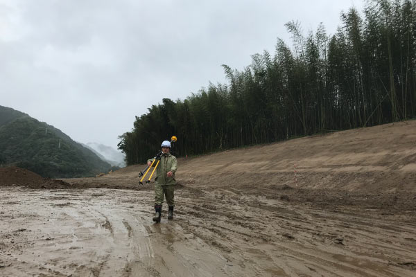 すでにICT施工が開始された現場から、工事延長が長くICT掘削範囲が広いため、RTK-GNSS基地局の移設作業依頼がありました。今後の施工作業にあたって適切な基地局の設置場所を、オペレーターさんと細かく確認しながら設置しました。当日は大雨の中での作業でしたが、無事に移設作業を終えることができました。